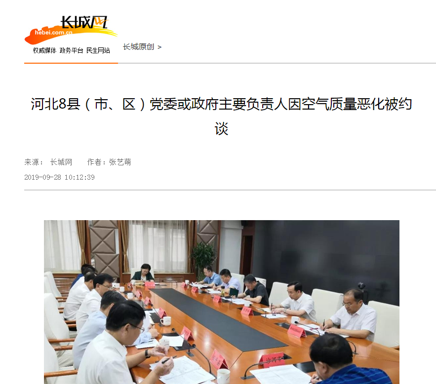 长城网讯(记者 张艺萌) 9月24日,河北省大气办对1-8月份未达到国家空气质量二级标准且月度空气质量综合指数或PM2.5平均浓度同比不降反升、改善幅度连续三个月排名后10位、大气环境问题突出的唐山市古冶区、固安县、黄骅市党委主要负责人,以及月度空气质量综合指数或PM2.5平均浓度同比不降反升累计3次及以上的馆陶县、安平县、磁县、邯郸市永年区、沙河市政府主要负责人进行公开约谈。
