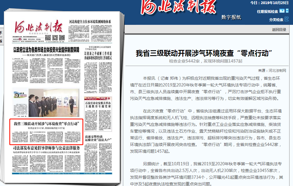 另据统计,截至10月19日,我省2019至2020年秋冬季第一轮大气环境执法专项行动中,全省各市共出动2.5万人次,出动无人机230架次,检查企业10455家次,发现并督促整改各类涉气环境问题3734个,公开曝光41起重点突出环境违法行为,其中涉及5起夜查执法检查发现的重点突出问题。