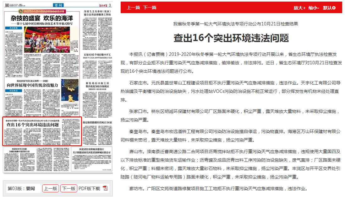 沧州市。河北普非特科技发展有限公司工程建设项目拒不执行重污染天气应急减排措施,违法作业。青县新兴镇小孝子墓村南无名粮食器械加工厂为新发现的“散乱污”企业,无环评审批手续及排污许可证,涉嫌违法生产。