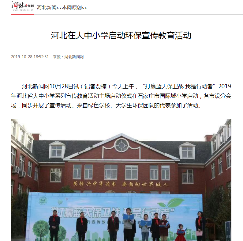 河北新闻网10月28日讯(记者贾楠)今天上午,“打赢蓝天保卫战 我是行动者”2019年河北省大中小学系列宣传教育活动主场启动仪式在石家庄市国际城小学启动,各市设分会场,同步开展了宣传活动。来自绿色学校、大学生环保团队的代表参加了活动。