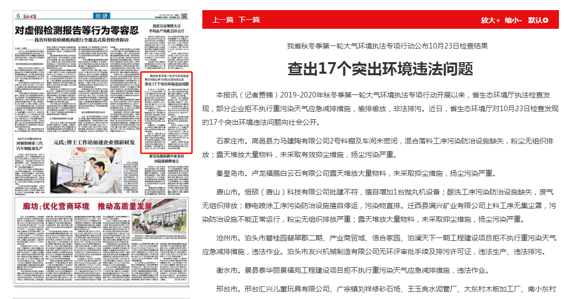 唐山市。恒硕(唐山)科技有限公司批建不符,擅自增加1台抛丸机设备;酸洗工序污染防治设施缺失,废气无组织排放;静电喷涂工序污染防治设施擅自停运,污染物直排。迁西县满兴矿业有限公司上料工序无集尘罩,污染防治设施不能正常运行,粉尘无组织排放严重;露天堆放大量物料,未采取抑尘措施,扬尘污染严重。