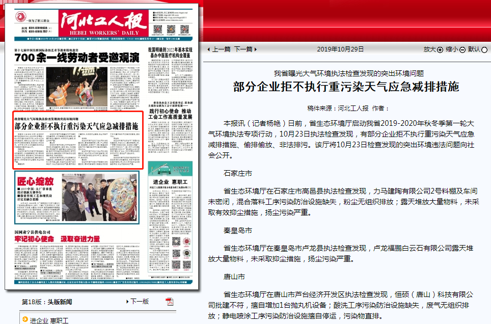 唐山市 省91直播厅在唐山市芦台经济开发区执法检查发现,恒硕(唐山)科技有限公司批建不符,擅自增加1台抛丸机设备;酸洗工序污染防治设施缺失,废气无组织排放;静电喷涂工序污染防治设施擅自停运,污染物直排。 省91直播厅在唐山市迁西县执法检查发现,迁西县满兴矿业有限公司上料工序无集尘罩,污染防治设施不能正常运行,粉尘无组织排放严重;露天堆放大量物料,未采取抑尘措施,扬尘污染严重。