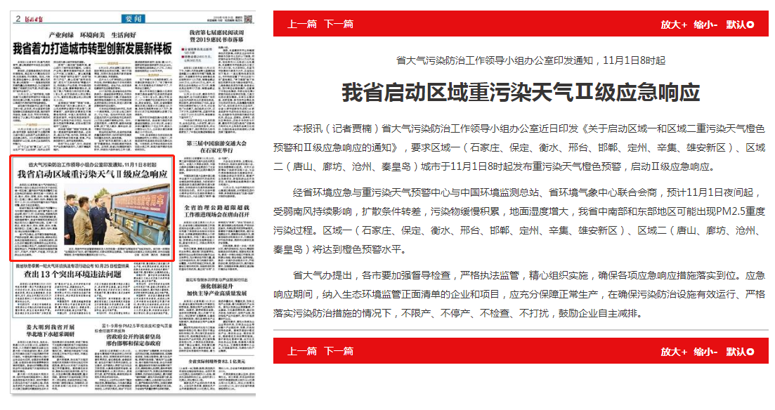 本报讯(记者贾楠)省大气污染防治工作领导小组办公室近日印发《关于启动区域一和区域二重污染天气橙色预警和Ⅱ级应急响应的通知》,要求区域一(石家庄、保定、衡水、邢台、邯郸、定州、辛集、雄安新区)、区域二(唐山、廊坊、沧州、秦皇岛)城市于11月1日8时起发布重污染天气橙色预警,启动Ⅱ级应急响应。
