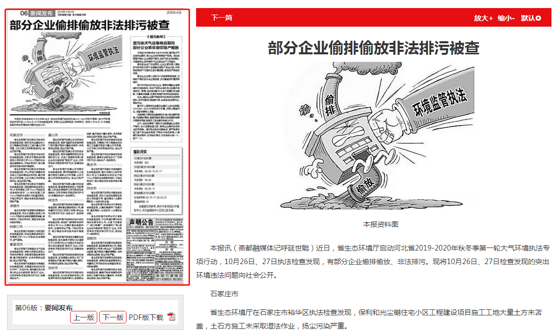 本报讯(燕都融媒体记呼延世聪)近日,省91直播厅启动河北省2019-2020年秋冬季第一轮大气环境执法专项行动,10月26日、27日执法检查发现,有部分企业偷排偷放、非法排污。现将10月26日、27日检查发现的突出环境违法问题向社会公开。