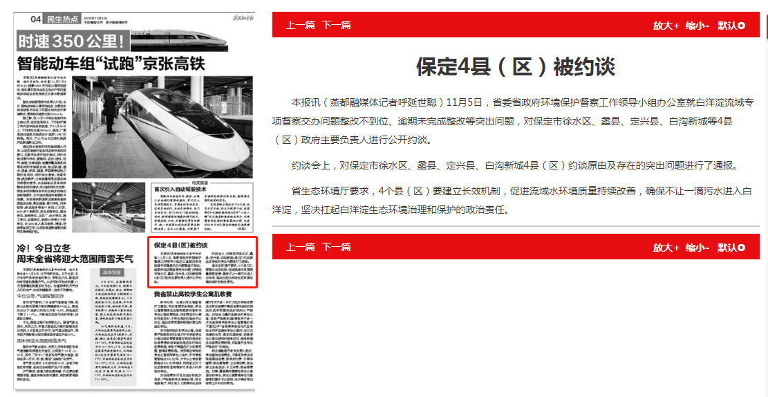 本报讯(燕都融媒体记者呼延世聪)11月5日,省委省政府环境保护督察工作领导小组办公室就白洋淀流域专项督察交办问题整改不到位、逾期未完成整改等突出问题,对保定市徐水区、蠡县、定兴县、白沟新城等4县(区)政府主要负责人进行公开约谈。