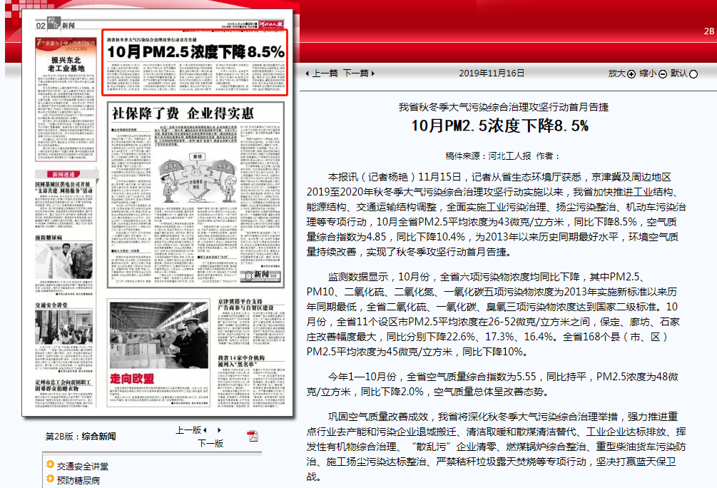 监测数据显示,10月份,全省六项污染物浓度均同比下降,其中PM2.5、PM10、二氧化硫、二氧化氮、一氧化碳五项污染物浓度为2013年实施新标准以来历年同期最低,全省二氧化硫、一氧化碳、臭氧三项污染物浓度达到国家二级标准。10月份,全省11个设区市PM2.5平均浓度在26-52微克/立方米之间,保定、廊坊、石家庄改善幅度最大,同比分别下降22.6%、17.3%、16.4%。全省168个县(市、区)PM2.5平均浓度为45微克/立方米,同比下降10%。
