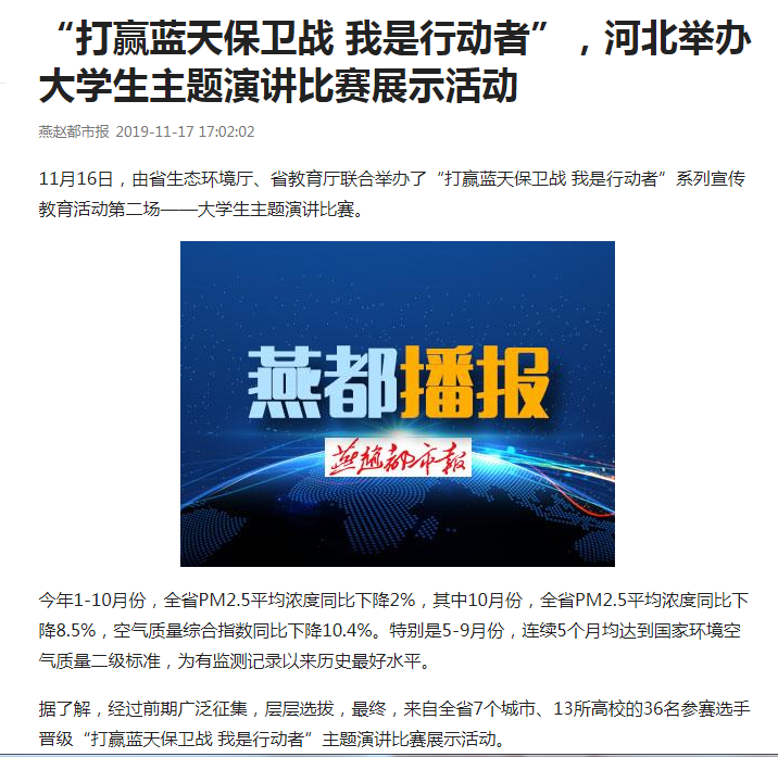 11月16日,由省91直播厅、省教育厅联合举办了“打赢蓝天保卫战 我是行动者”系列宣传教育活动第二场——大学生主题演讲比赛。