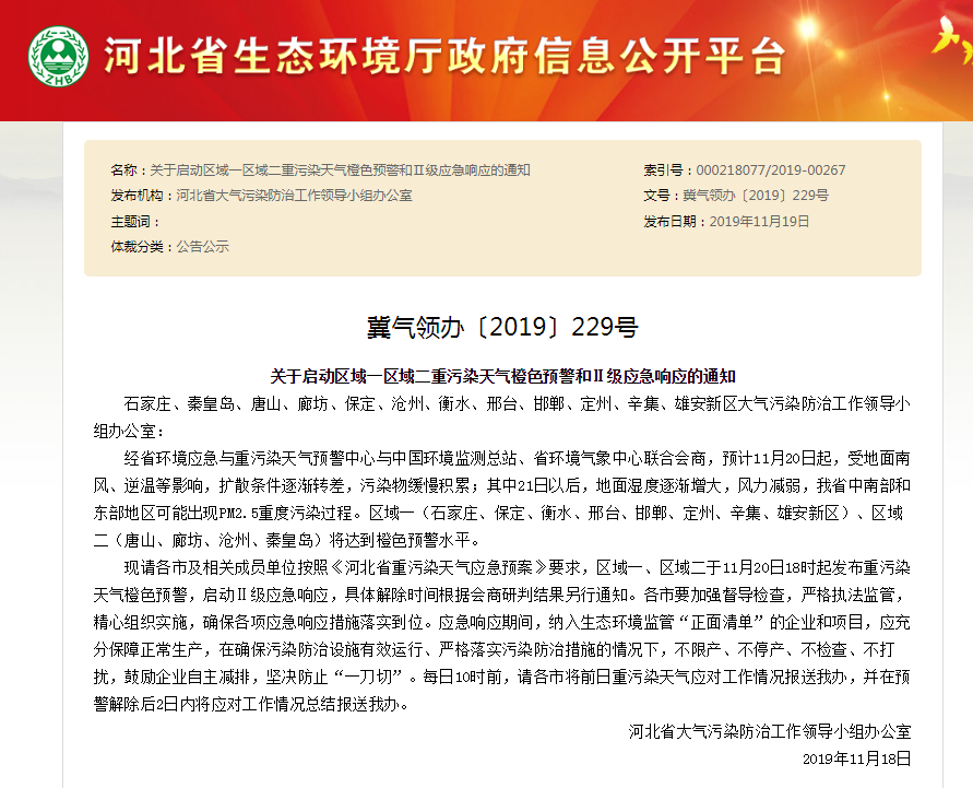 长城网:通知!11月20日18时起河北启动区域重污染天气Ⅱ级应急响应