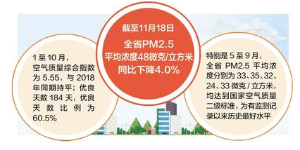 本报讯(记者贾楠)记者从省政府新闻办11月19日举行的河北省坚决打好秋冬季大气污染综合治理攻坚战新闻发布会上获悉,今年以来,我省空气质量持续改善。截至11月18日,全省PM2.5平均浓度48微克/立方米,同比下降4.0%。1至10月,空气质量综合指数为5.55,与2018年同期持平;优良天数184天,优良天数比例为60.5%。特别是5至9月,全省PM2.5平均浓度分别为33、35、32、24、33微克/立方米,均达到国家空气质量二级标准,为有监测记录以来历史最好水平。