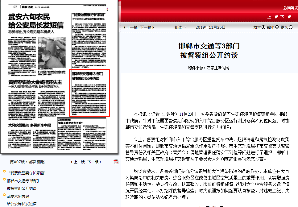 燕赵晚报:邯郸市交通等3部门被督察组公开约谈