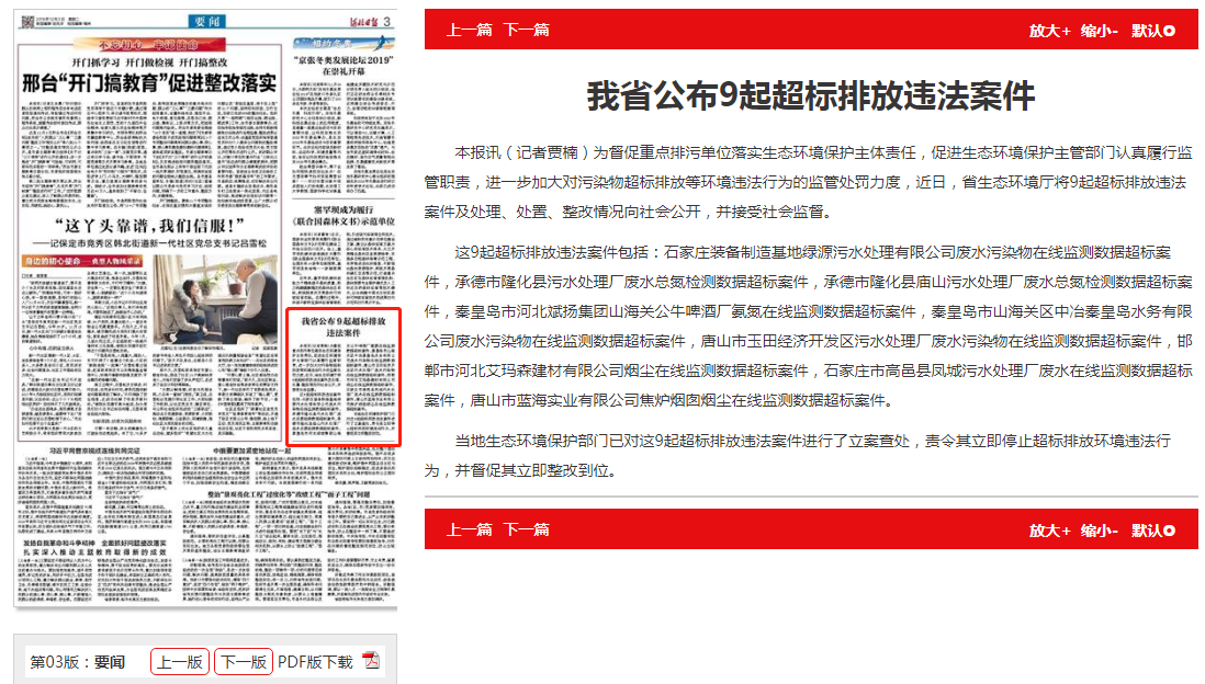 这9起超标排放违法案件包括:石家庄装备制造基地绿源污水处理有限公司废水污染物在线监测数据超标案件,承德市隆化县污水处理厂废水总氮检测数据超标案件,承德市隆化县庙山污水处理厂废水总氮检测数据超标案件,秦皇岛市河北斌扬集团山海关公牛啤酒厂氨氮在线监测数据超标案件,秦皇岛市山海关区中冶秦皇岛水务有限公司废水污染物在线监测数据超标案件,唐山市玉田经济开发区污水处理厂废水污染物在线监测数据超标案件,邯郸市河北艾玛森建材有限公司烟尘在线监测数据超标案件,石家庄市高邑县凤城污水处理厂废水在线监测数据超标案件,唐山市蓝海实业有限公司焦炉烟囱烟尘在线监测数据超标案件。
