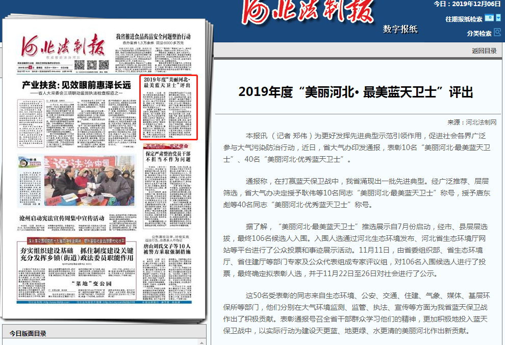 通报称,在打赢蓝天保卫战中,我省涌现出一批先进典型。经广泛推荐、层层筛选,省大气办决定授予耿伟等10名同志“美丽河北·最美蓝天卫士”称号,授予唐东彪等40名同志“美丽河北·优秀蓝天卫士”称号。
