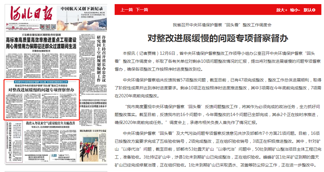 中央环境保护督察“回头看”及大气污染问题专项督察反馈意见共涉及邯郸市7个方面21项问题。目前,16项已按整改方案要求完成了五级验收销号,2项完成整改,正在组织验收销号,3项正在积极推进整改。其中,针对矿山“以停代治”问题,截至目前,邯郸市53处露天矿山“以停代治”问题中,50处到期矿山整治项目主体工程已完工,准备验收。3处持证矿山中,涉县1处未到期矿山已完成整治,正在组织验收。峰峰矿区1处采矿证到期的露天矿山已经完成修复治理,正在组织验收。1处未到期矿山已采取洒水、苫盖等防尘抑尘工作,正在进一步整改中。
