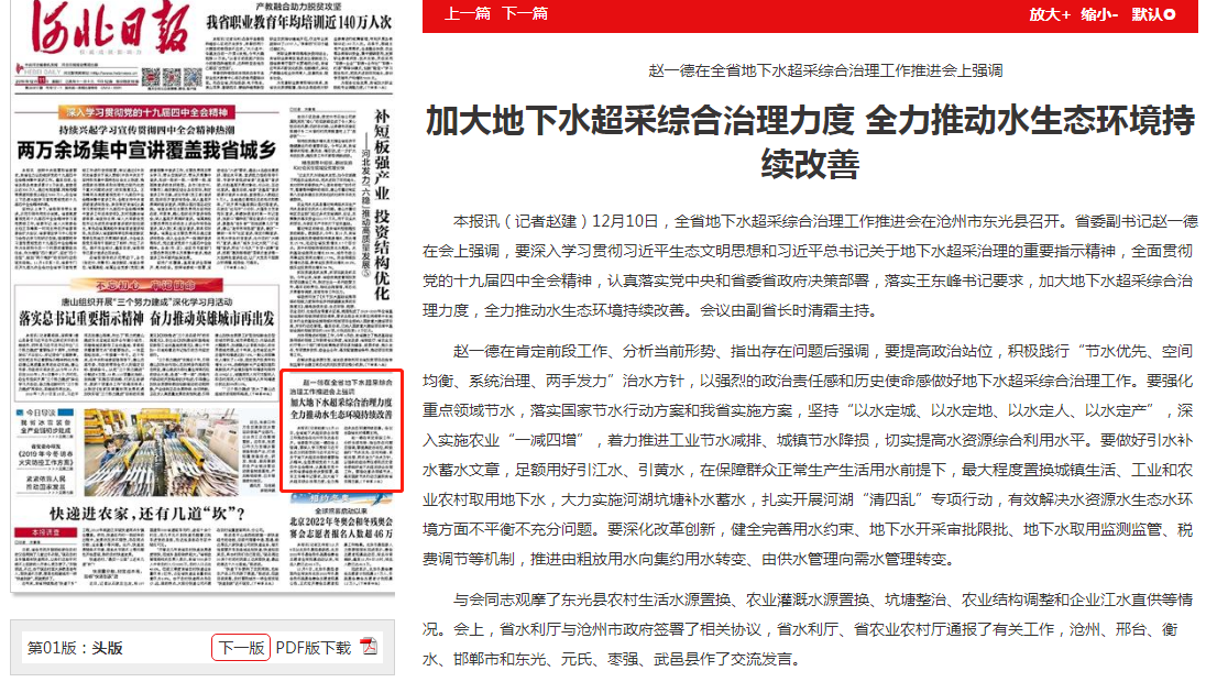 本报讯(记者赵建)12月10日,全省地下水超采综合治理工作推进会在沧州市东光县召开。省委副书记赵一德在会上强调,要深入学习贯彻习近平生态文明思想和习近平总书记关于地下水超采治理的重要指示精神,全面贯彻党的十九届四中全会精神,认真落实党中央和省委省政府决策部署,落实王东峰书记要求,加大地下水超采综合治理力度,全力推动水91直播持续改善。会议由副省长时清霜主持。