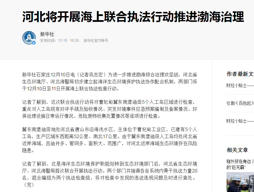 新华社:河北将开展海上联合执法行动推进渤海治理