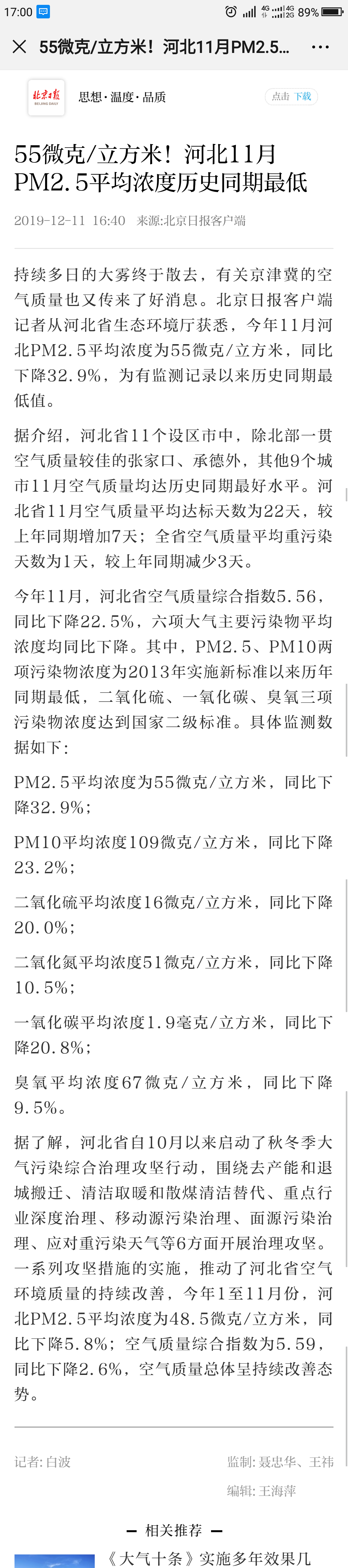 北京日报客户端:55微克立方米!河北11月PM2.5平均浓度历史同期最低