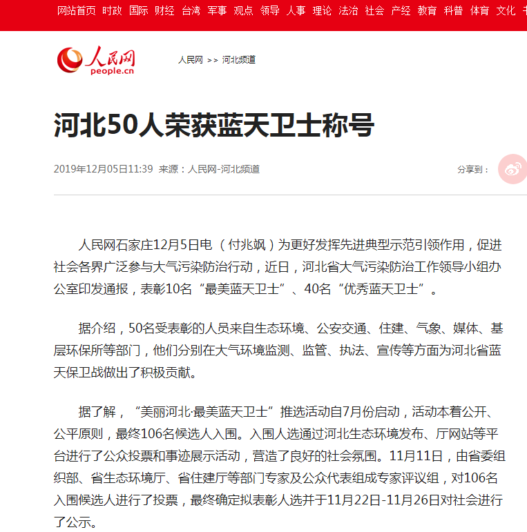 人民网石家庄12月5日电 (付兆飒)为更好发挥先进典型示范引领作用,促进社会各界广泛参与大气污染防治行动,近日,河北省大气污染防治工作领导小组办公室印发通报,表彰10名“最美蓝天卫士”、40名“优秀蓝天卫士”。