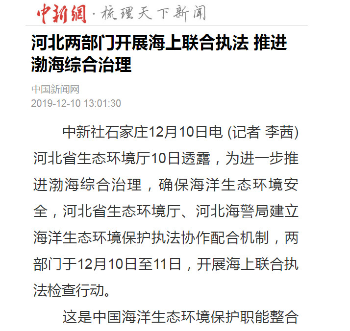中国新闻网:河北两部门开展海上联合执法 推进渤海综合治理