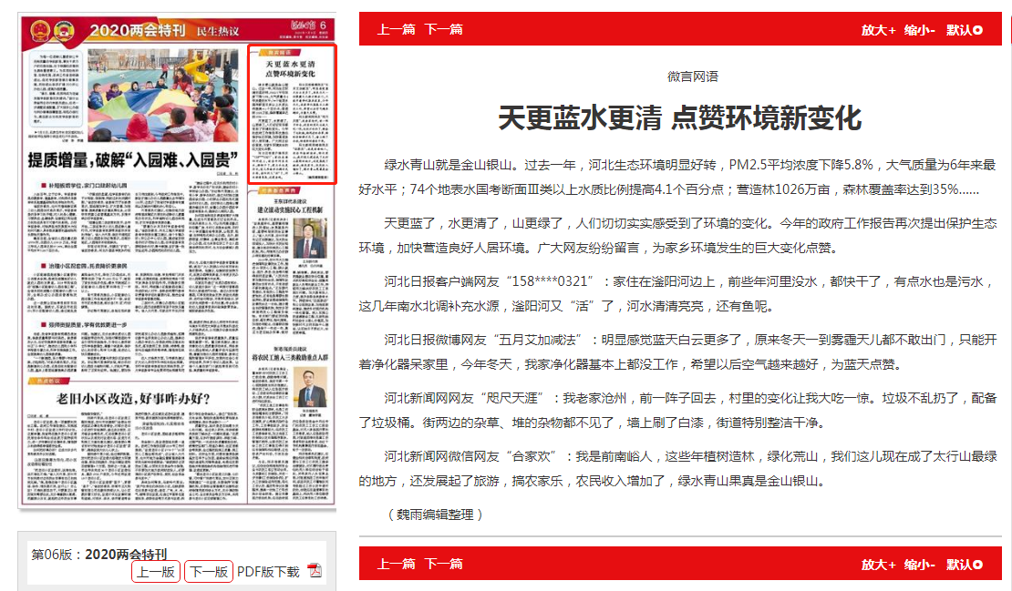 河北新闻网网友“咫尺天涯”:我老家沧州,前一阵子回去,村里的变化让我大吃一惊。垃圾不乱扔了,配备了垃圾桶。街两边的杂草、堆的杂物都不见了,墙上刷了白漆,街道特别整洁干净。