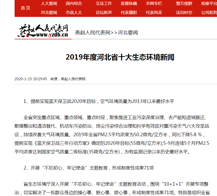 全省突出重点区域、重点领域、重点时段,聚焦推进工业污染深度治理、去产能和退城搬迁、散煤整治和清洁替代、机动车污染防治、扬尘污染综合治理和科学有效应对重污染天气六大攻坚战役,持续改善大气环境质量。2019年全省PM2.5平均浓度为50.2微克/立方米,同比下降5.8 %,提前实现《蓝天保卫战三年行动方案》确定的2020年目标(55微克/立方米);5-9月连续5个月PM2.5平均浓度达到国家空气质量二级标准(35微克/立方米),为有监测记录以来历史最好水平。