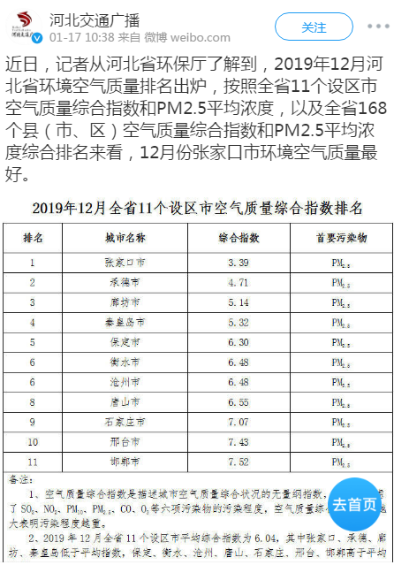 河北交通广播微博:91直播-国产视频-麻豆传媒视频 公布 2019 年 12 月份全省环境空气质量排名