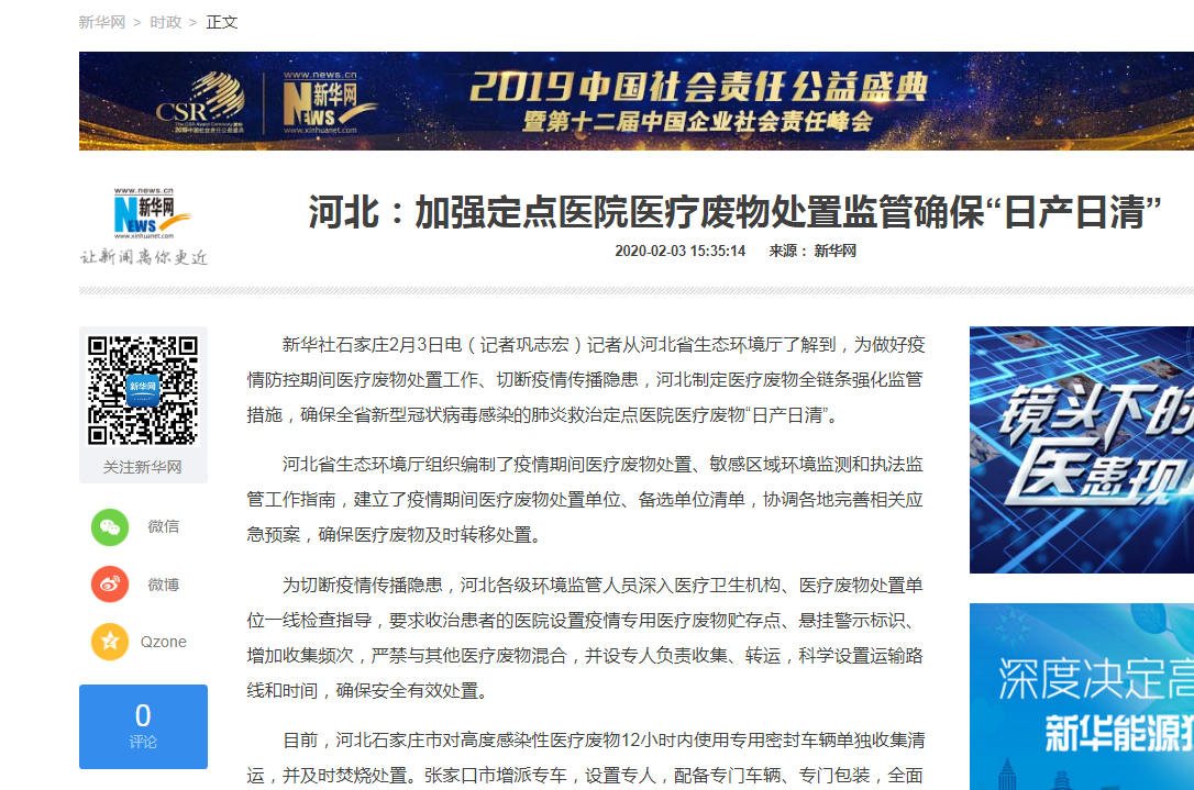 了解到,为做好疫情防控期间医疗废物处置工作、切断疫情传播隐患,河北制定医疗废物全链条强化监管措施,确保全省新型冠状病毒感染的肺炎救治定点医院医疗废物“日产日清”。