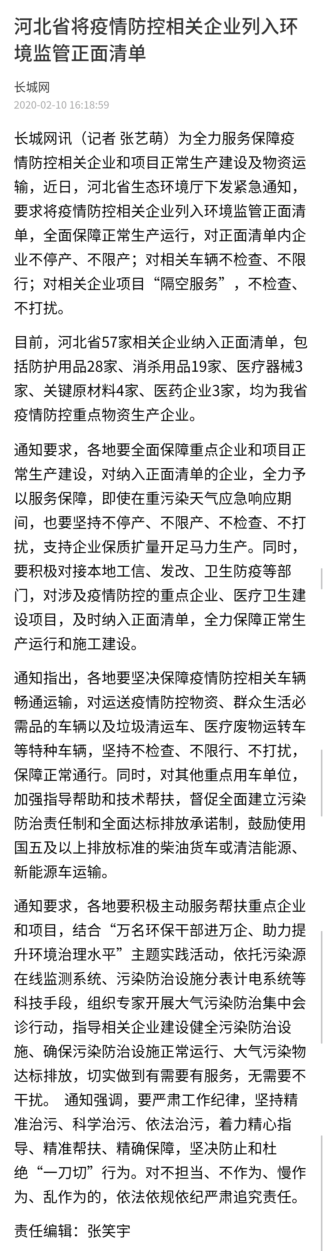 长城网:河北省将疫情防控相关企业列入环境监管正面清单