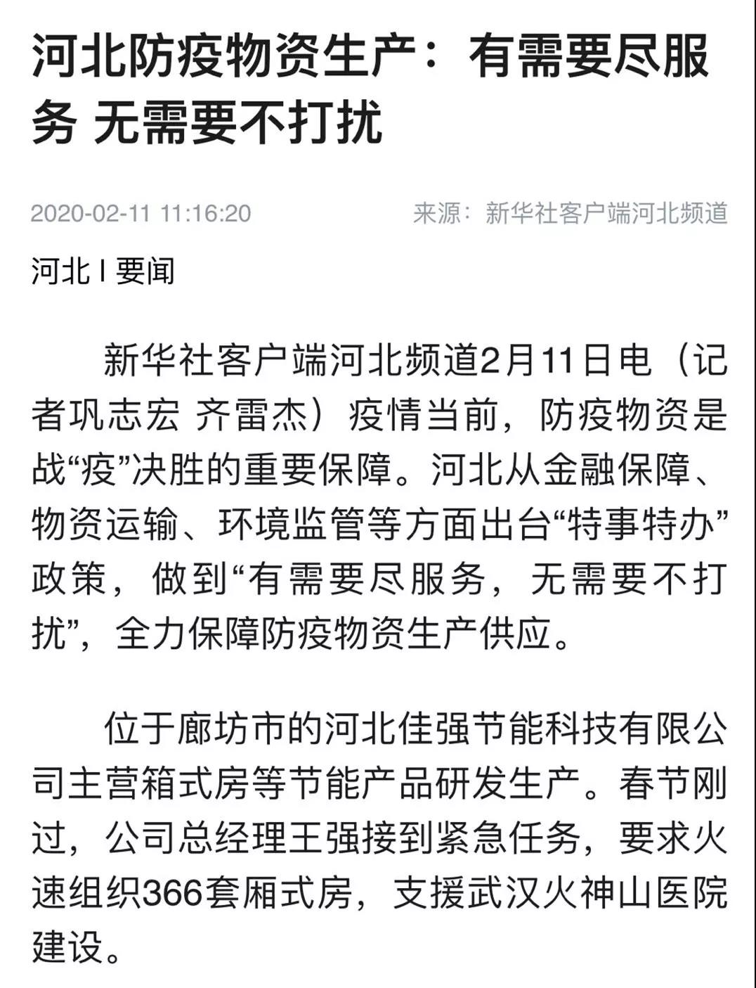 位于廊坊市的河北佳强节能科技有限公司主营箱式房等节能产品研发生产。春节刚过,公司总经理王强接到紧急任务,要求火速组织366套厢式房,支援武汉火神山医院建设。