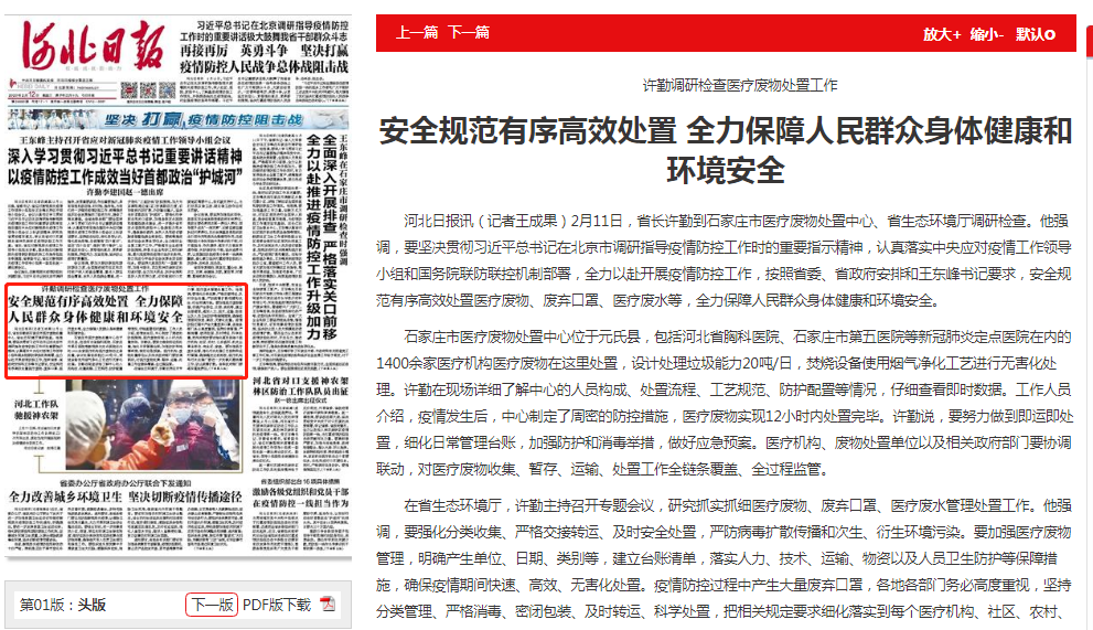 河北日报讯(记者王成果)2月11日,省长许勤到石家庄市医疗废物处置中心、省91直播厅调研检查。他强调,要坚决贯彻习近平总书记在北京市调研指导疫情防控工作时的重要指示精神,认真落实中央应对疫情工作领导小组和91直播 联防联控机制部署,全力以赴开展疫情防控工作,按照省委、省政府安排和王东峰书记要求,安全规范有序高效处置医疗废物、废弃口罩、医疗废水等,全力保障人民群众身体健康和环境安全。