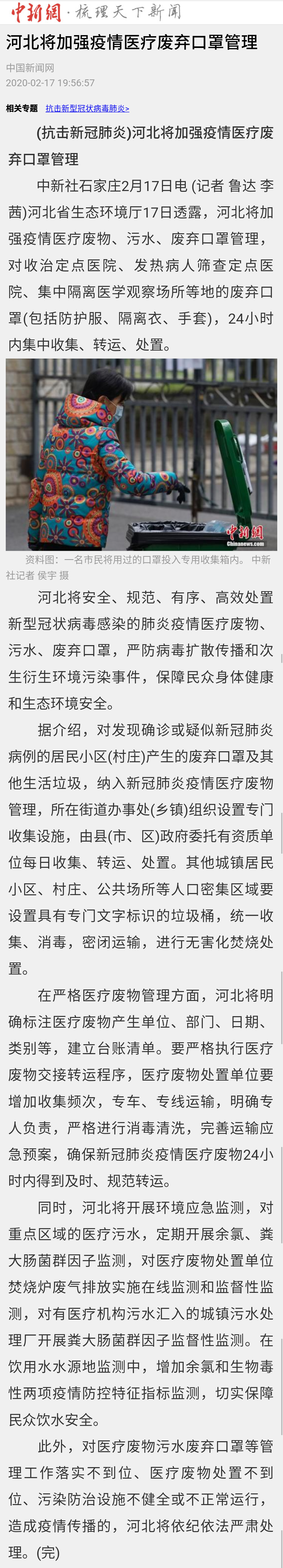 中国新闻网:河北将加强疫情医疗废弃口罩管理