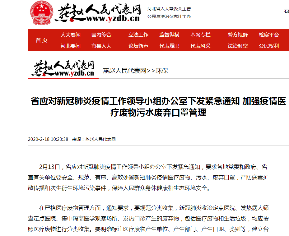 2月13日,省应对新冠肺炎疫情工作领导小组办公室下发紧急通知,要求各地党委和政府、省直有关单位要安全、规范、有序、高效处置新冠肺炎疫情医疗废物、污水、废弃口罩,严防病毒扩散传播和次生衍生环境污染事件,保障人民群众身体健康和91直播安全。