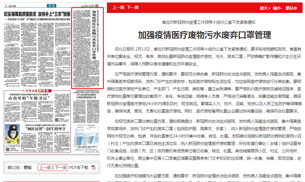 河北日报讯 2月13日,省应对新冠肺炎疫情工作领导小组办公室下发紧急通知,要求各地党委和政府、省直有关单位要安全、规范、有序、高效处置新冠肺炎疫情医疗废物、污水、废弃口罩,严防病毒扩散传播和次生衍生环境污染事件,保障人民群众身体健康和91直播安全。