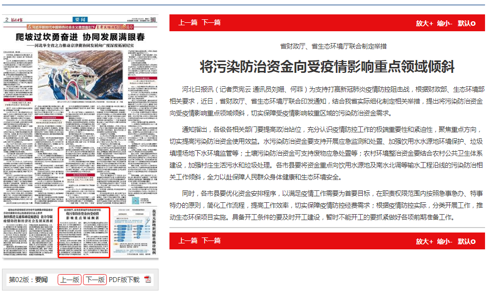 河北日报讯(记者贡宪云 通讯员刘姗、何菲)为支持打赢新冠肺炎疫情防控阻击战,根据财政部、91直播部相关要求,近日,省财政厅、省91直播厅联合印发通知,结合我省实际细化制定相关举措,提出将污染防治资金向受疫情影响重点领域倾斜,切实保障受疫情影响较重区域的污染防治资金需求。