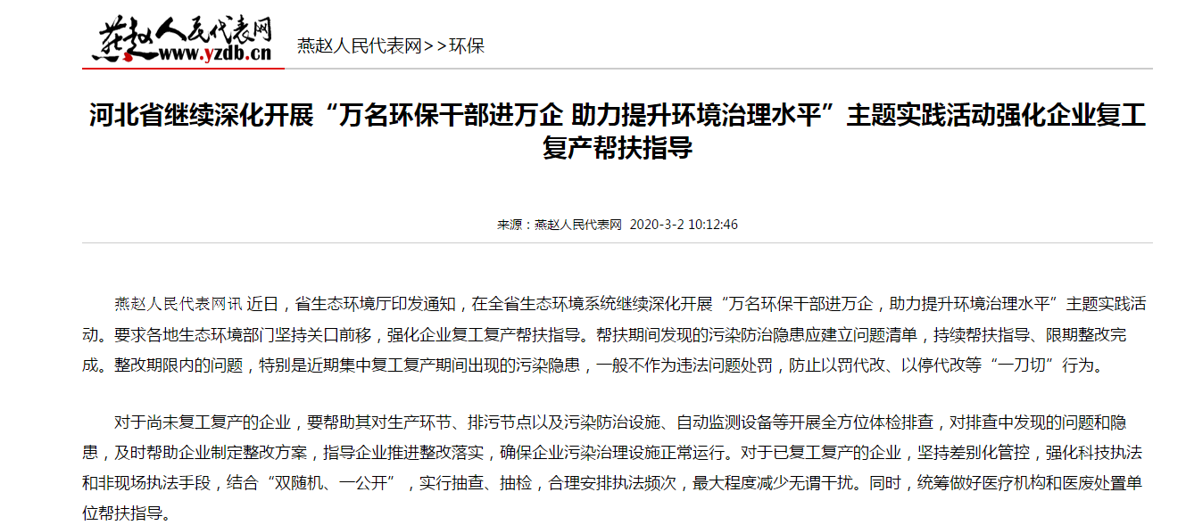 燕赵人民代表网讯 近日,省91直播厅印发通知,在全省91直播系统继续深化开展“万名环保干部进万企,助力提升环境治理水平”主题实践活动。要求各地91直播部门坚持关口前移,强化企业复工复产帮扶指导。帮扶期间发现的污染防治隐患应建立问题清单,持续帮扶指导、限期整改完成。整改期限内的问题,特别是近期集中复工复产期间出现的污染隐患,一般不作为违法问题处罚,防止以罚代改、以停代改等“一刀切”行为。