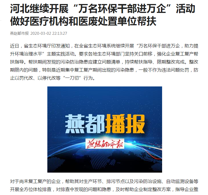燕赵都市报:做好医疗机构和医废处置单位帮扶