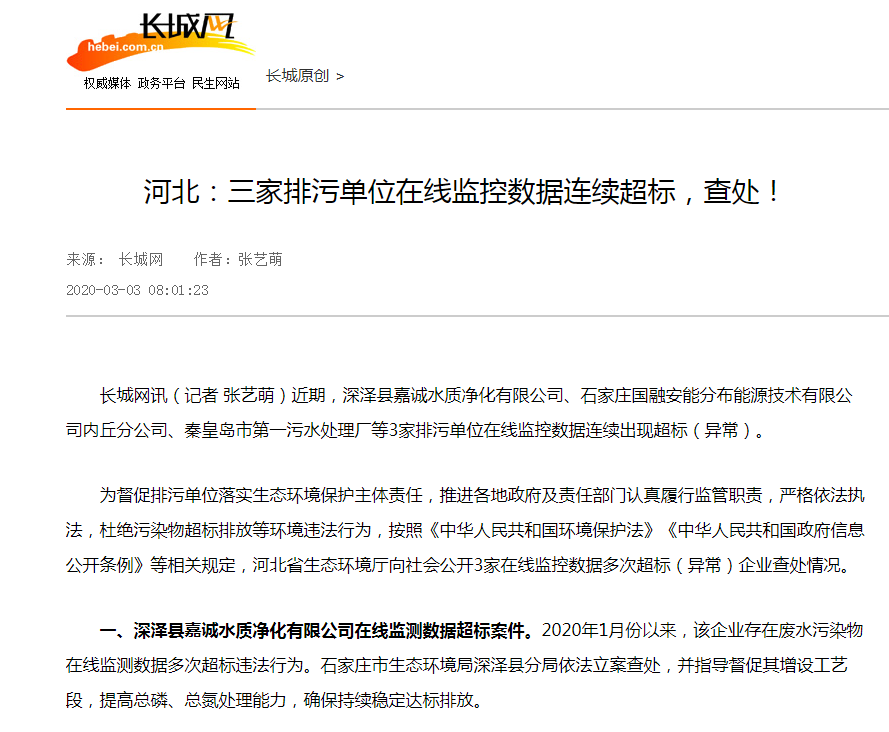 一、深泽县嘉诚水质净化有限公司在线监测数据超标案件。2020年1月份以来,该企业存在废水污染物在线监测数据多次超标违法行为。石家庄市91直播局深泽县分局依法立案查处,并指导督促其增设工艺段,提高总磷、总氮处理能力,确保持续稳定达标排放。