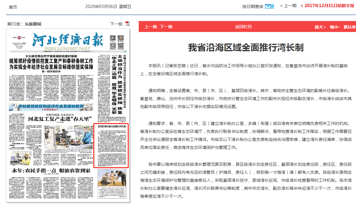 本报讯(记者张艺萌)近日,省水污染防治工作领导小组办公室印发通知,在秦皇岛市试点开展湾长制的基础上,在全省沿海区域全面推行湾长制。