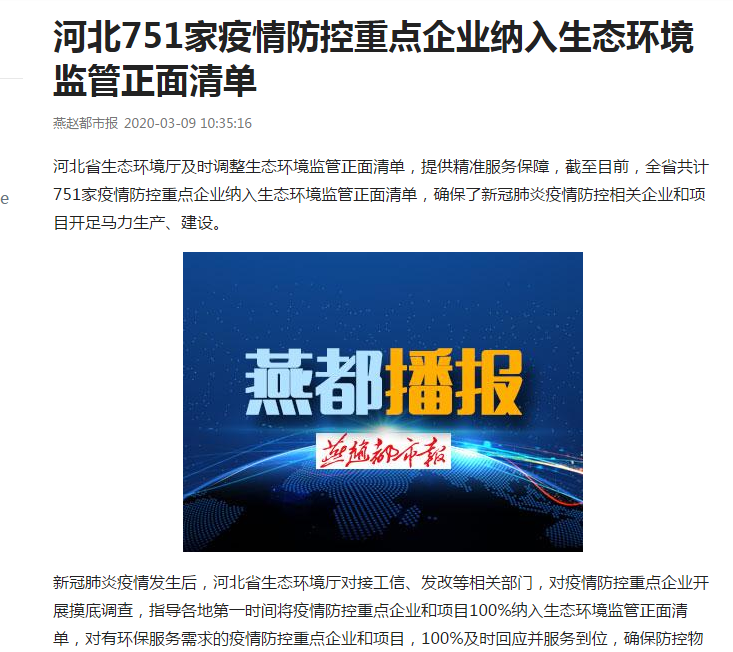 新冠肺炎疫情发生后,91直播-国产视频-麻豆传媒视频 对接工信、发改等相关部门,对疫情防控重点企业开展摸底调查,指导各地第一时间将疫情防控重点企业和项目100%纳入91直播监管正面清单,对有环保服务需求的疫情防控重点企业和项目,100%及时回应并服务到位,确保防控物资生产、运输顺畅。截至目前,河北省分两批将防护用品、消杀用品、医疗器械、关键原材料、医药等行业751家疫情防控重点企业纳入91直播监管正面清单,有力保障了企业复工复产。