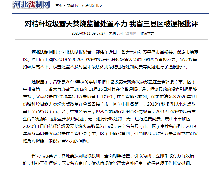 河北法制网 :对秸秆垃圾露天焚烧监管处置不力 我省三县区被通报批评