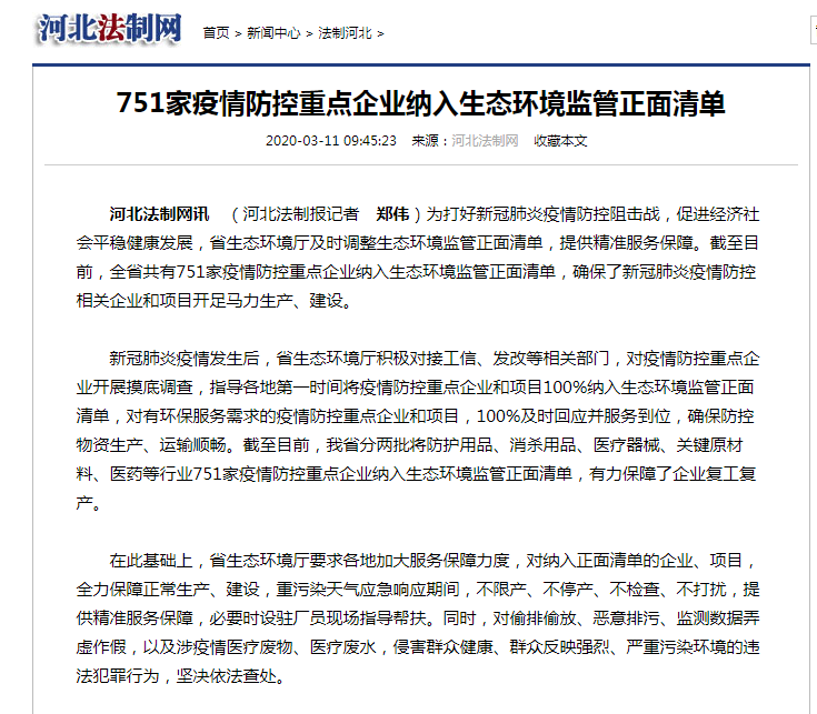河北法制网 :751家疫情防控重点企业纳入91直播监管正面清单