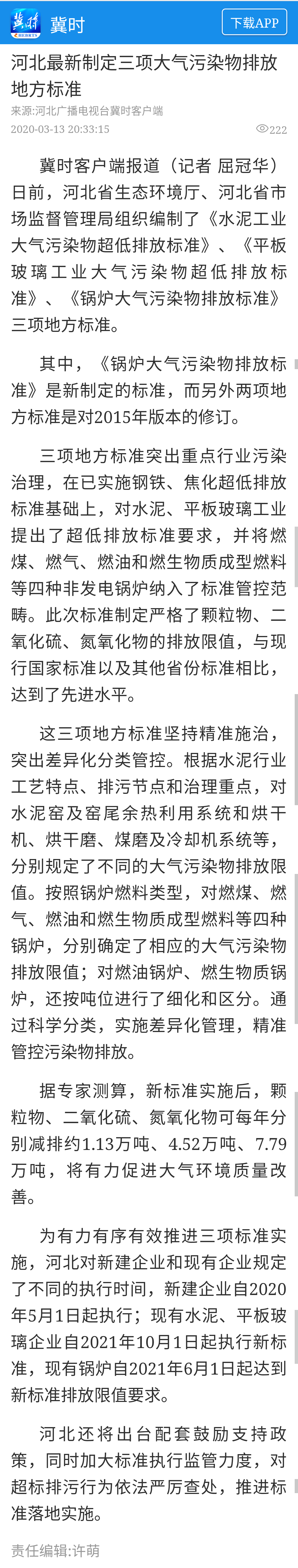 河北广播电视台冀时客户端:河北最新制定三项大气污染物排放地方标准