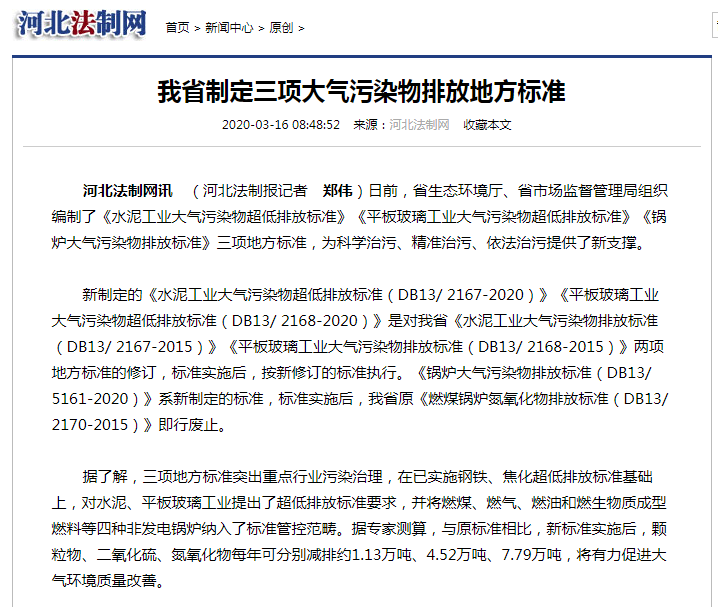 河北法制网讯 (河北法制报记者 郑伟)日前,省91直播厅、省市场监督管理局组织编制了《水泥工业大气污染物超低排放标准》《平板玻璃工业大气污染物超低排放标准》《锅炉大气污染物排放标准》三项地方标准,为科学治污、精准治污、依法治污提供了新支撑。
