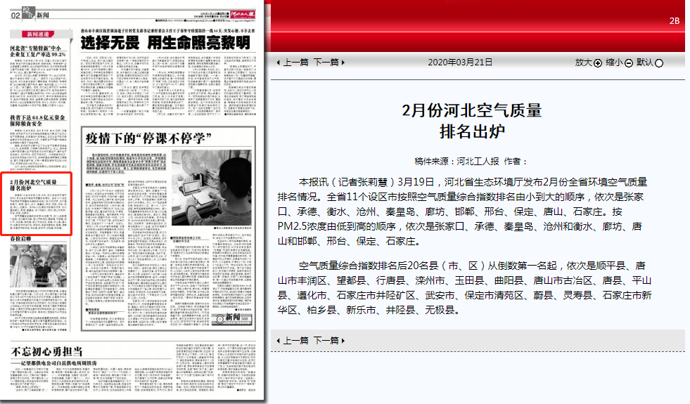 发布2月份全省环境空气质量排名情况。全省11个设区市按照空气质量综合指数排名由小到大的顺序,依次是张家口、承德、衡水、沧州、秦皇岛、廊坊、邯郸、邢台、保定、唐山、石家庄。按PM2.5浓度由低到高的顺序,依次是张家口、承德、秦皇岛、沧州和衡水、廊坊、唐山和邯郸、邢台、保定、石家庄。