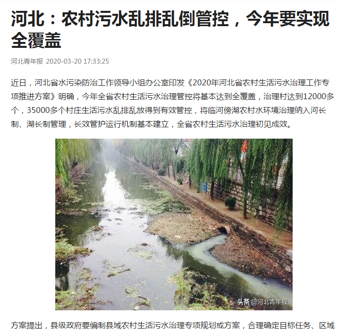 近日,河北省水污染防治工作领导小组办公室印发《2020年河北省农村生活污水治理工作专项推进方案》明确,今年全省农村生活污水治理管控将基本达到全覆盖,治理村达到12000多个,35000多个村庄生活污水乱排乱放得到有效管控,将临河傍湖农村水环境治理纳入河长制、湖长制管理,长效管护运行机制基本建立,全省农村生活污水治理初见成效。