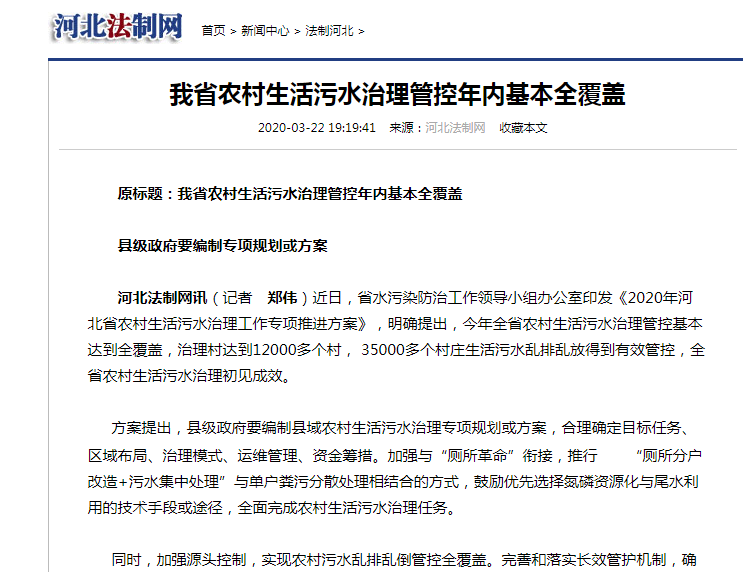 河北法制网讯(记者 郑伟)近日,省水污染防治工作领导小组办公室印发《2020年河北省农村生活污水治理工作专项推进方案》,明确提出,今年全省农村生活污水治理管控基本达到全覆盖,治理村达到12000多个村, 35000多个村庄生活污水乱排乱放得到有效管控,全省农村生活污水治理初见成效。