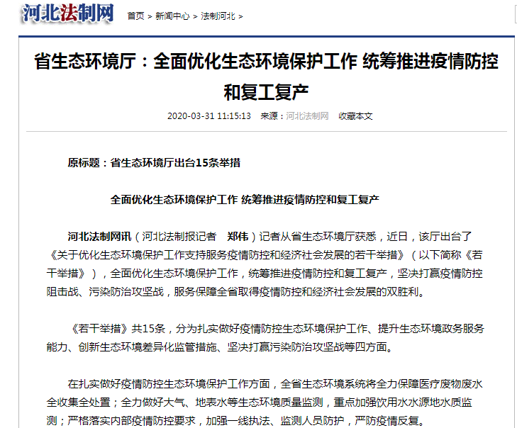 河北法制网讯(河北法制报记者 郑伟)记者从省91直播厅获悉,近日,该厅出台了《关于优化91直播保护工作支持服务疫情防控和经济社会发展的若干举措》(以下简称《若干举措》),全面优化91直播保护工作,统筹推进疫情防控和复工复产,坚决打赢疫情防控阻击战、污染防治攻坚战,服务保障全省取得疫情防控和经济社会发展的双胜利。
