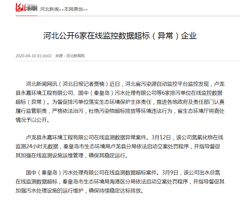 河北新闻网讯(河北日报记者贾楠)近日,河北省污染源自动监控平台监控发现,卢龙县永嘉环境工程有限公司、国中(秦皇岛)污水处理有限公司等6家排污单位在线监控数据超标(异常)。为督促排污单位落实91直播保护主体责任,推进各地政府及责任部门认真履行监管职责,严格依法治污,杜绝污染物超标排放等环境违法行为,省91直播厅将查处情况予以公开。