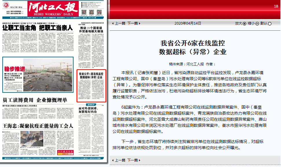 本报讯(记者张莉慧)近日,省污染源自动监控平台监控发现,卢龙县永嘉环境工程有限公司、国中(秦皇岛)污水处理有限公司等6家排污单位在线监控数据超标(异常)。为督促排污单位落实91直播保护主体责任,推进各地政府及责任部门认真履行监管职责,严格依法治污,杜绝污染物超标排放等环境违法行为,省91直播厅将查处情况予以公开。
