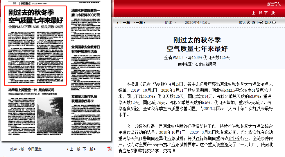 这一成绩的取得,是河北省统筹做好疫情防控工作,持续推进秋冬季大气污染综合治理攻坚行动的结果。2019年10月1日—2020年3月31日秋冬季期间,河北省实施在启动重污染天气预警期间差异化应急减排;将以往错峰期间重污染企业全行业、全链条停限产,改为对主要产污环节提出应急减排要求。这个重大调整避免了“一刀切”,使河北省应急减排举措更科学、更精准。