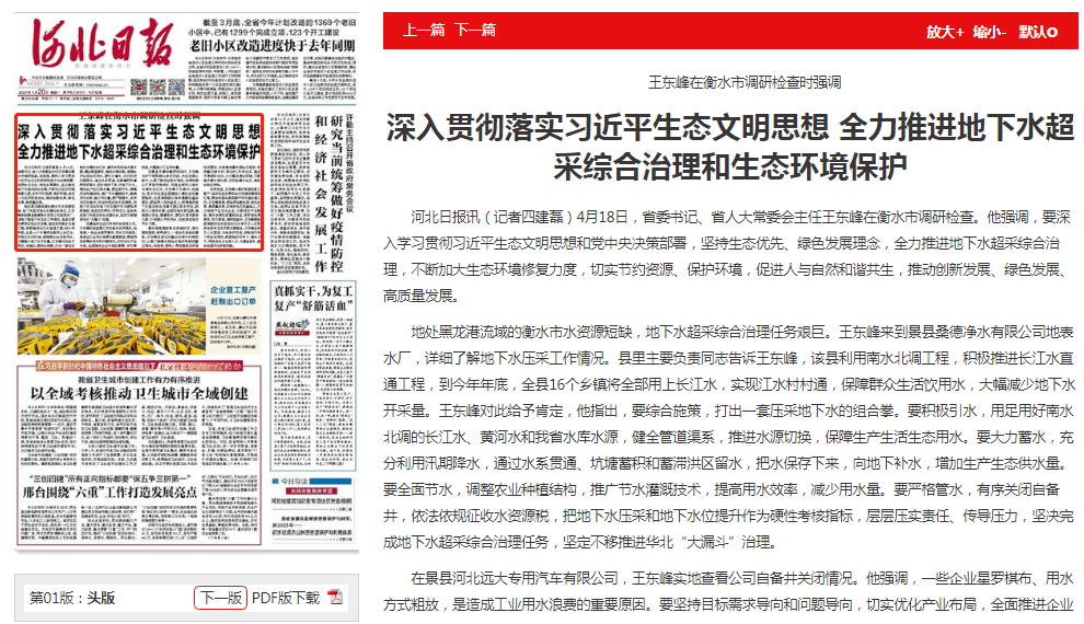 河北日报讯(记者四建磊)4月18日,省委书记、省人大常委会主任王东峰在衡水市调研检查。他强调,要深入学习贯彻习近平生态文明思想和党中央决策部署,坚持生态优先、绿色发展理念,全力推进地下水超采综合治理,不断加大91直播修复力度,切实节约资源、保护环境,促进人与自然和谐共生,推动创新发展、绿色发展、高质量发展。